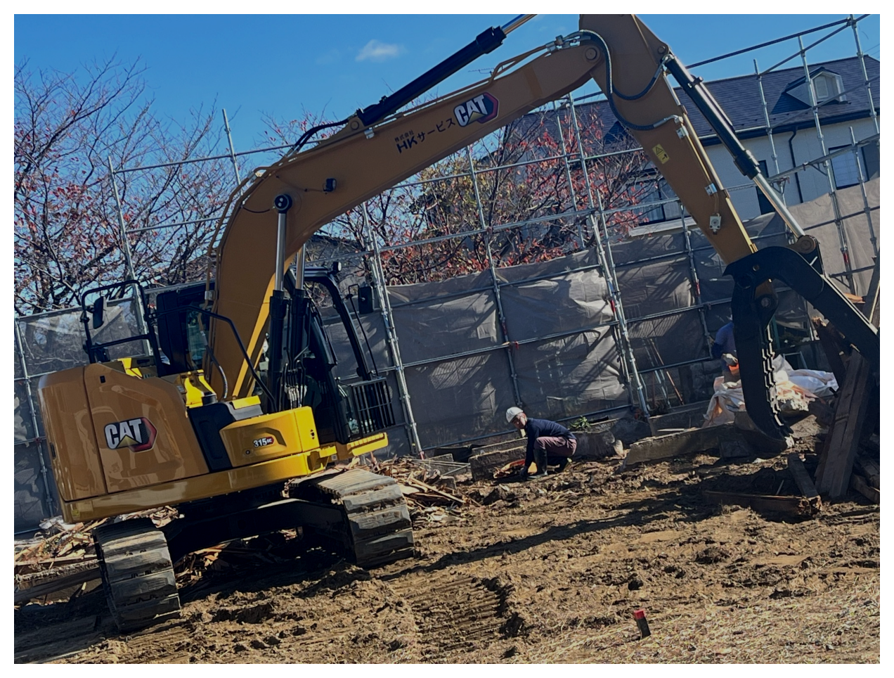 全解体工事は自社保有の重機を用いて安全かつ迅速に対応。必要に応じて養生足場を設置し、粉塵やゴミの飛散を防止します。